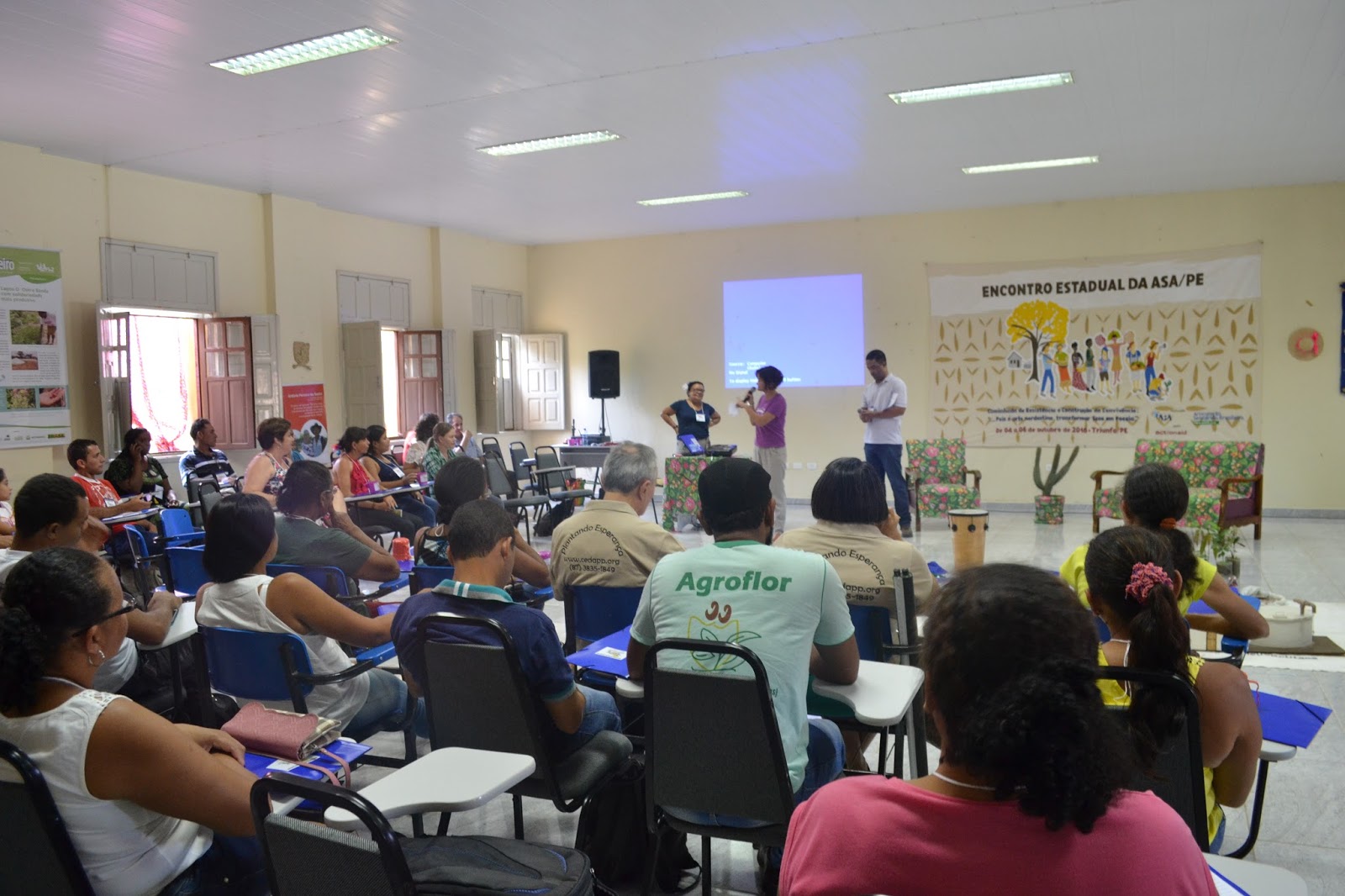 É com o tema “Caminhada de resistência e construção da convivência: ‘…pois é arte nordestina, transformar seca em poesia’”, que a ASA Pernambuco iniciou, na última terça-feira (04), no Stella Maris, em Triunfo (PE), o Encontro Estadual, com um público de agricultores/as familiares, técnicos/as, comunicadores/as e convidados/as, que ultrapassou a marca de cem pessoas. Do Litoral ao Sertão, o Encontro, que vai até a próxima quinta-feira (06), acolhe participantes de todos os territórios, que aproveitaram a oportunidade para apresentar vários elementos regionais, como sementes crioulas, mandacarus, artesanatos, instrumentos musicais e até a réplica de uma casa com cisterna. Músicas e poesias também incrementaram o momento de boas-vindas.